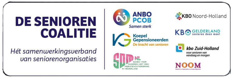 De Seniorencoalitie is het samenwerkingsverband tussen ANBO-PCOB, Koepel Gepensioneerden, NOOM,  SOMNL en de KBO-bonden Noord-Holland, Zuid-Holland en Gelderland. Samen behartigen we de belangen van alle senioren in Nederland. En samen laten we uw stem nóg krachtiger horen. Dat doen we zowel in Den Haag als regionaal en lokaal.
